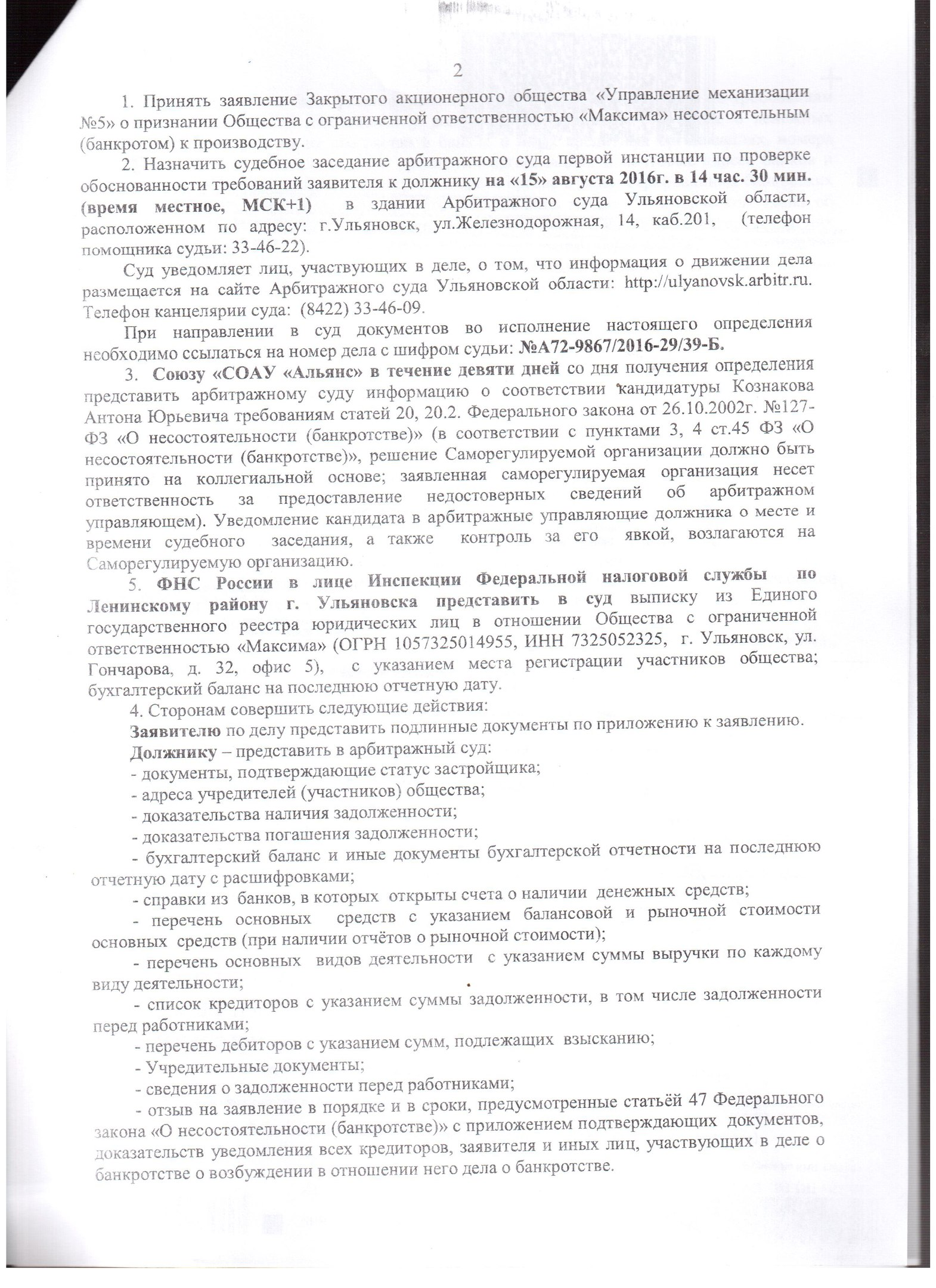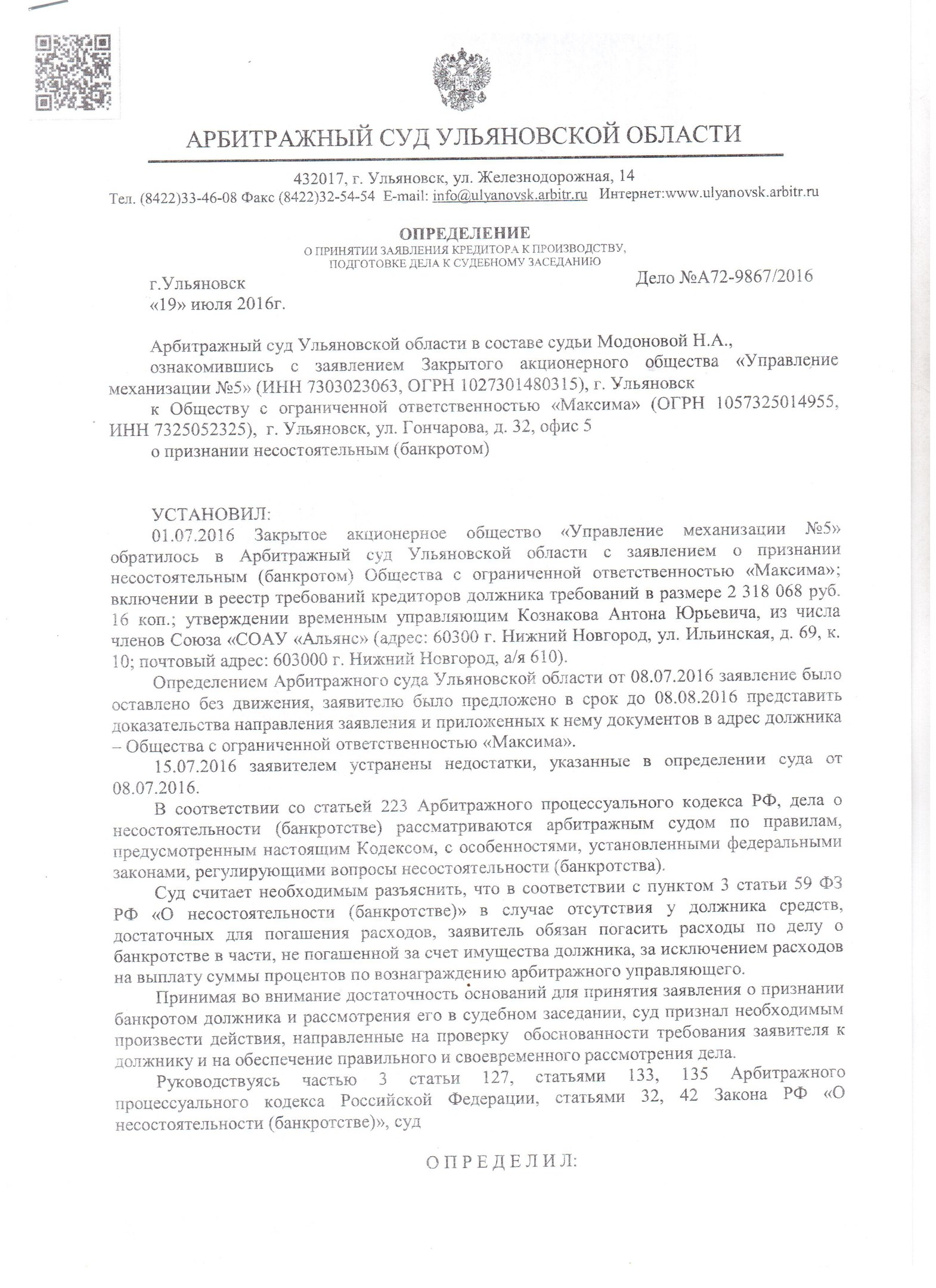 Более того, на сегодняшний день, в Арбитражный суд Ульяновской области поступило заявление от ЗАО «Управление механизации № 5» о признании ООО «МАКСИМА» банкротом. Уже состоялось судебное заседание 15.08.2016 года по проверке обоснованности требований заявителя к должнику. Согласно определению Арбитражного суда Ульяновской области ООО «МАКСИМА» задолжало более 2,3 млн. руб. строительной компании.
