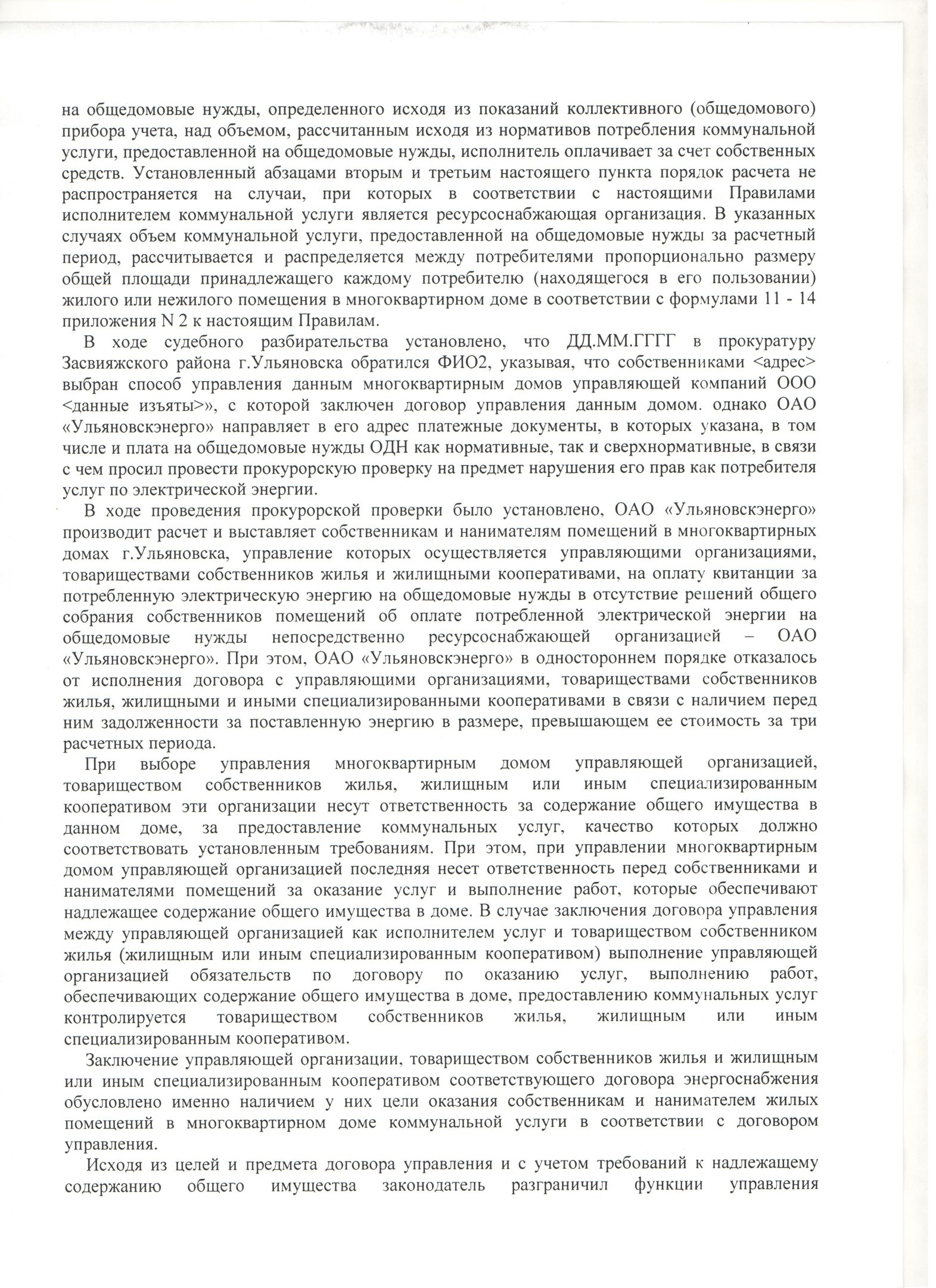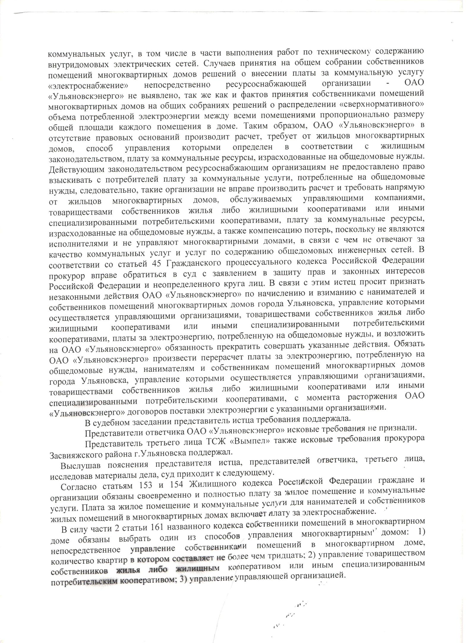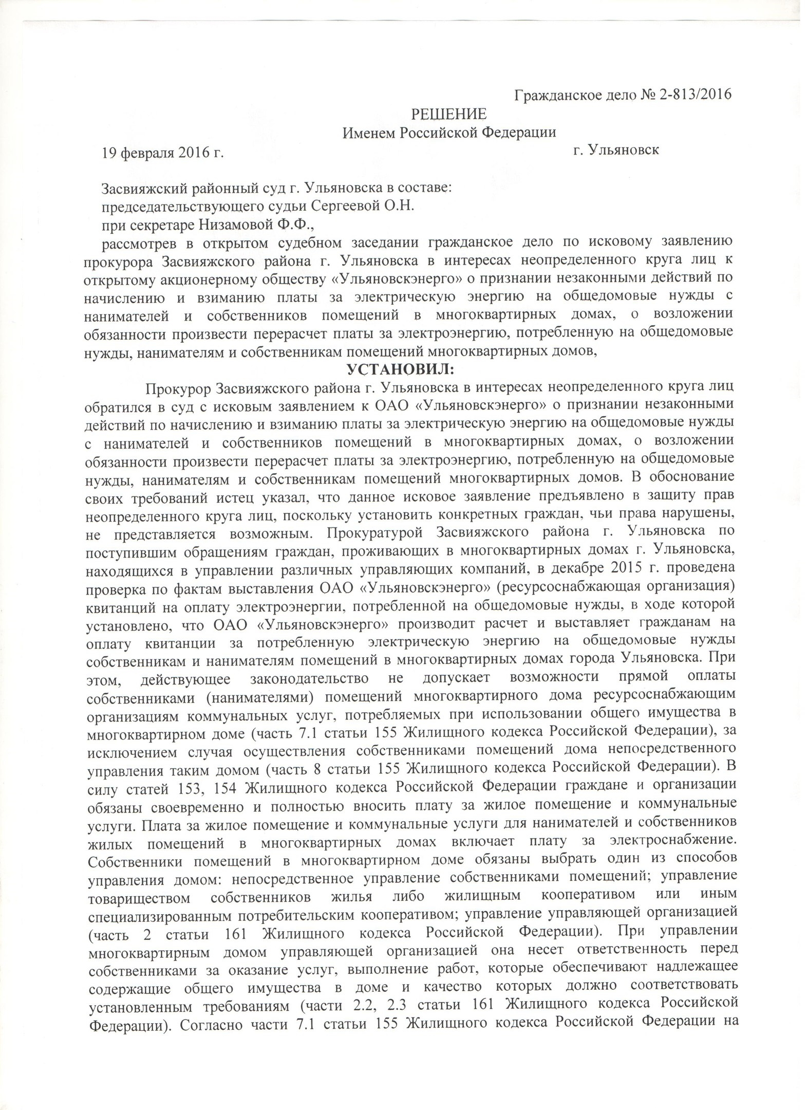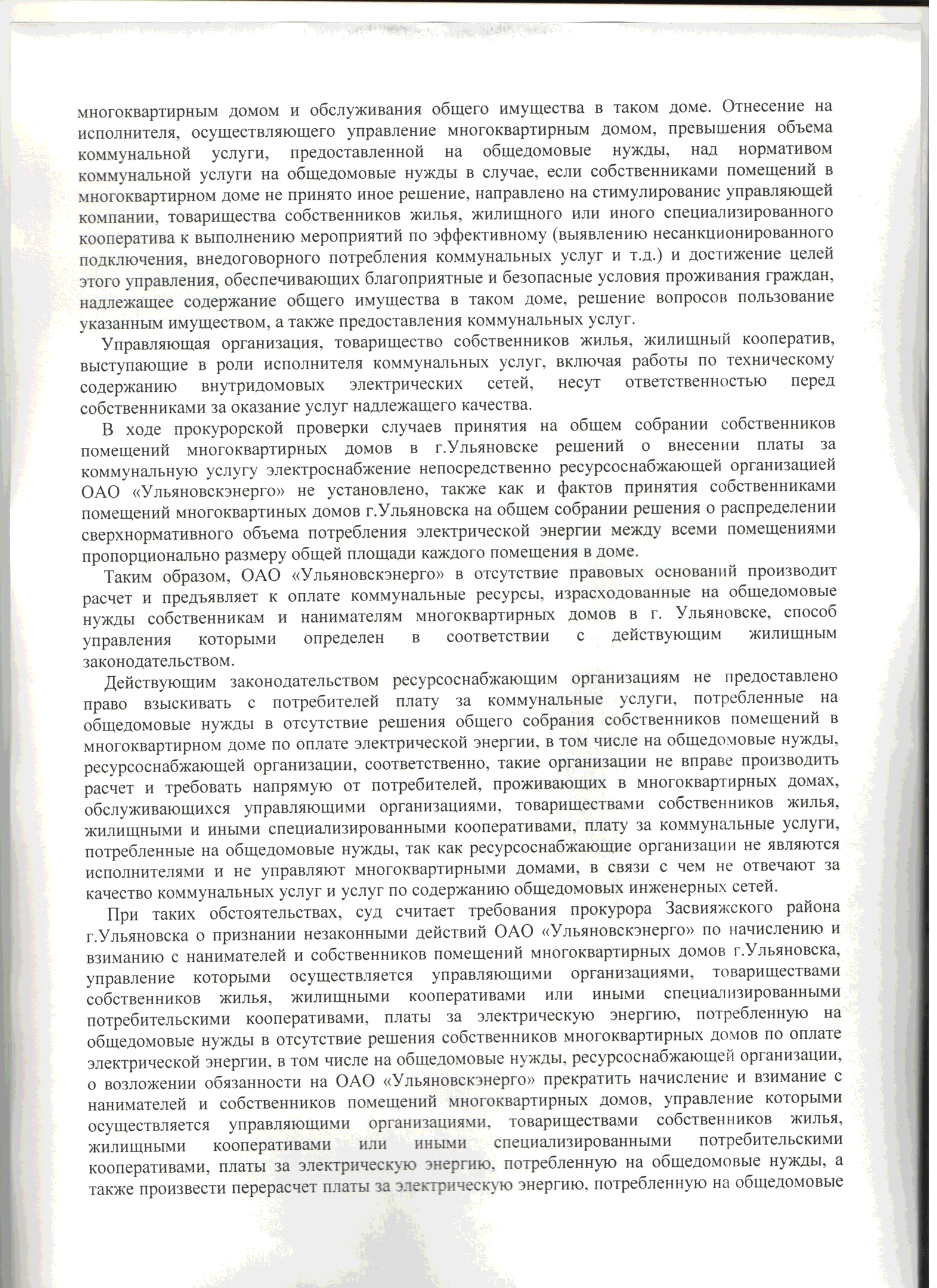 Прокуратура Засвияжского района г. Ульяновска выиграла гражданское дело предъявленное к ОАО «Ульяновскэнерго» о признании незаконными действий по начислению и взиманию платы ха электрическую энергию на ОДН с нанимателей и собственников помещений в МКД.